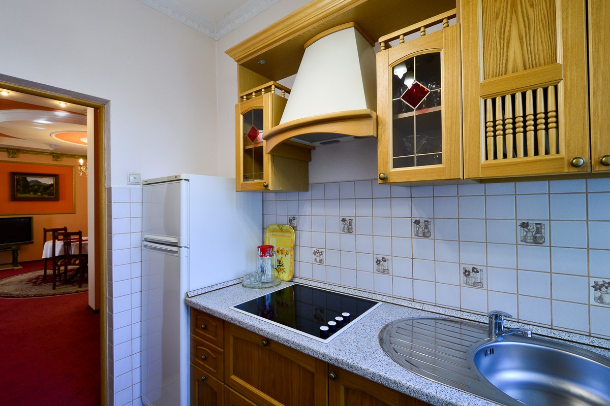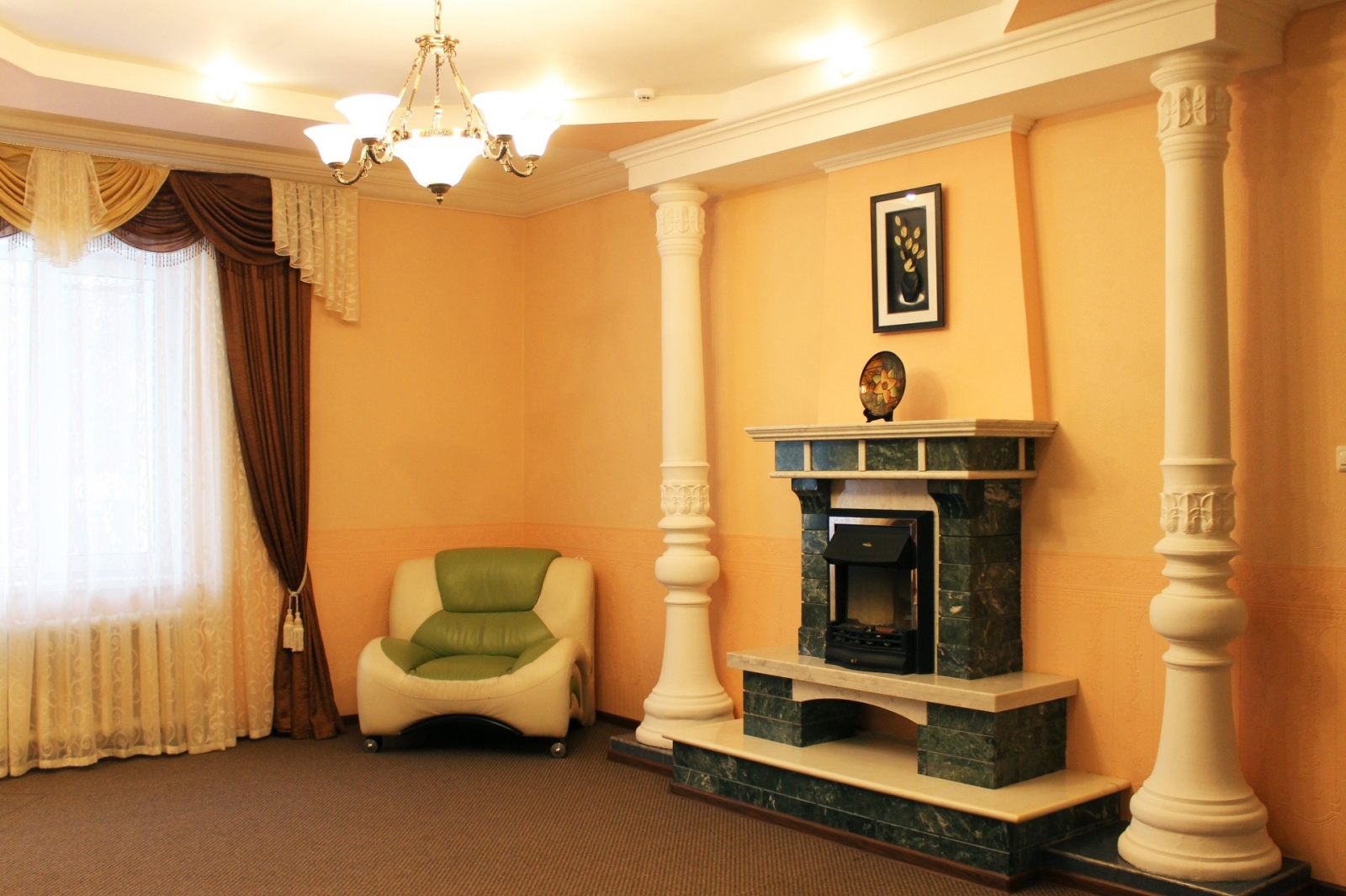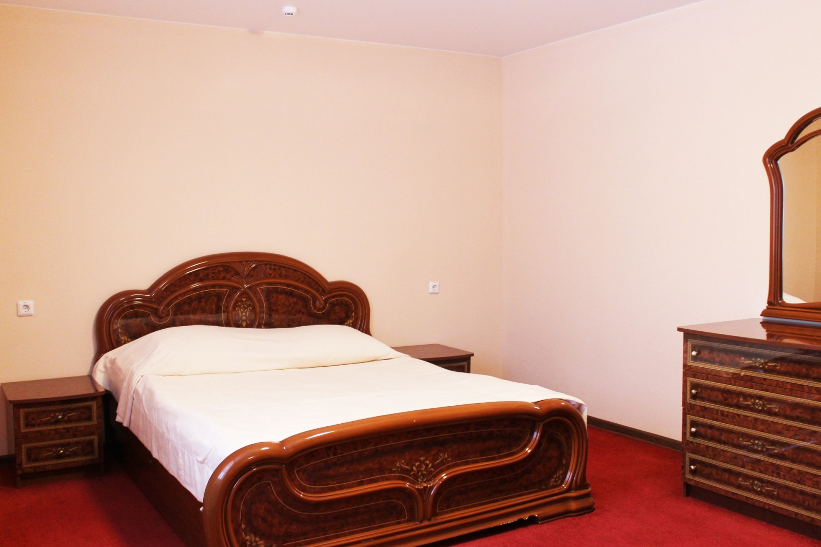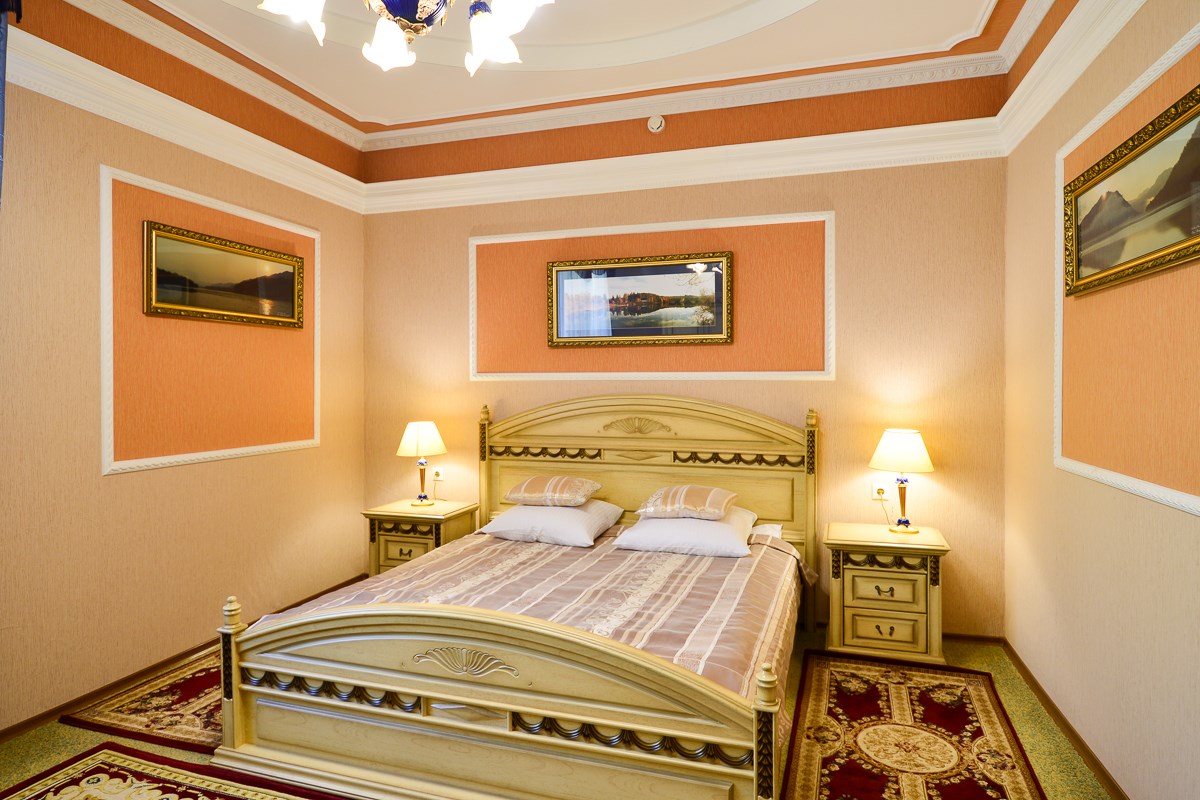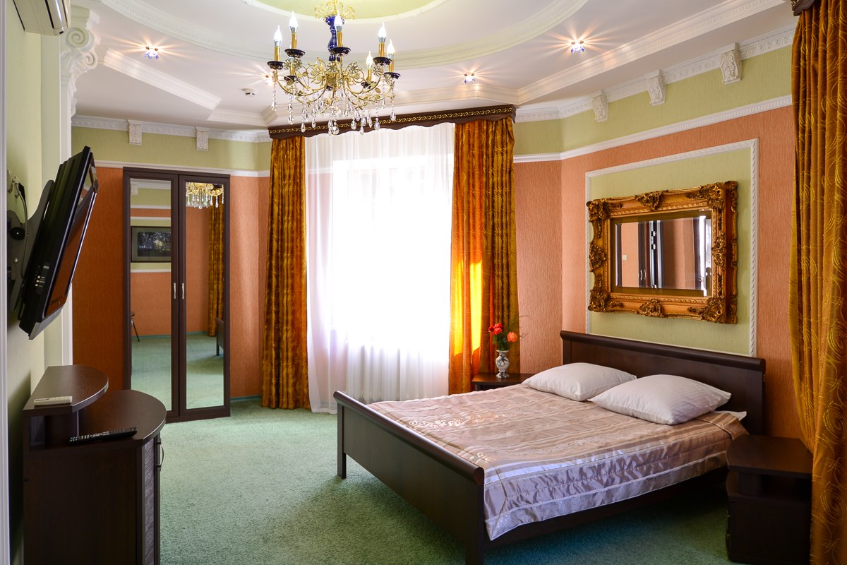 Площадь номера - 100 кв.м. 2 осн. места. 2 доп. места. Балкон. Мебель: вешалка, зеркало, кровати односпальные /одна двуспальная кровать, набор мягкой мебели, прикроватные тумбочки, стол, стулья, шкаф. Оборудование: вентилятор, индивидуальная система обогрева, камин, кондиционер, музыкальный центр, набор посуды, сейф, телевизор, холодильник, чайный набор посуды. Санузел: биде, сауна, с душем или ванной, тапочки, туалетные принадлежности, фен, халат. Сервис: room-сервис, смена полотенец, смена постельного белья, уборка номера.