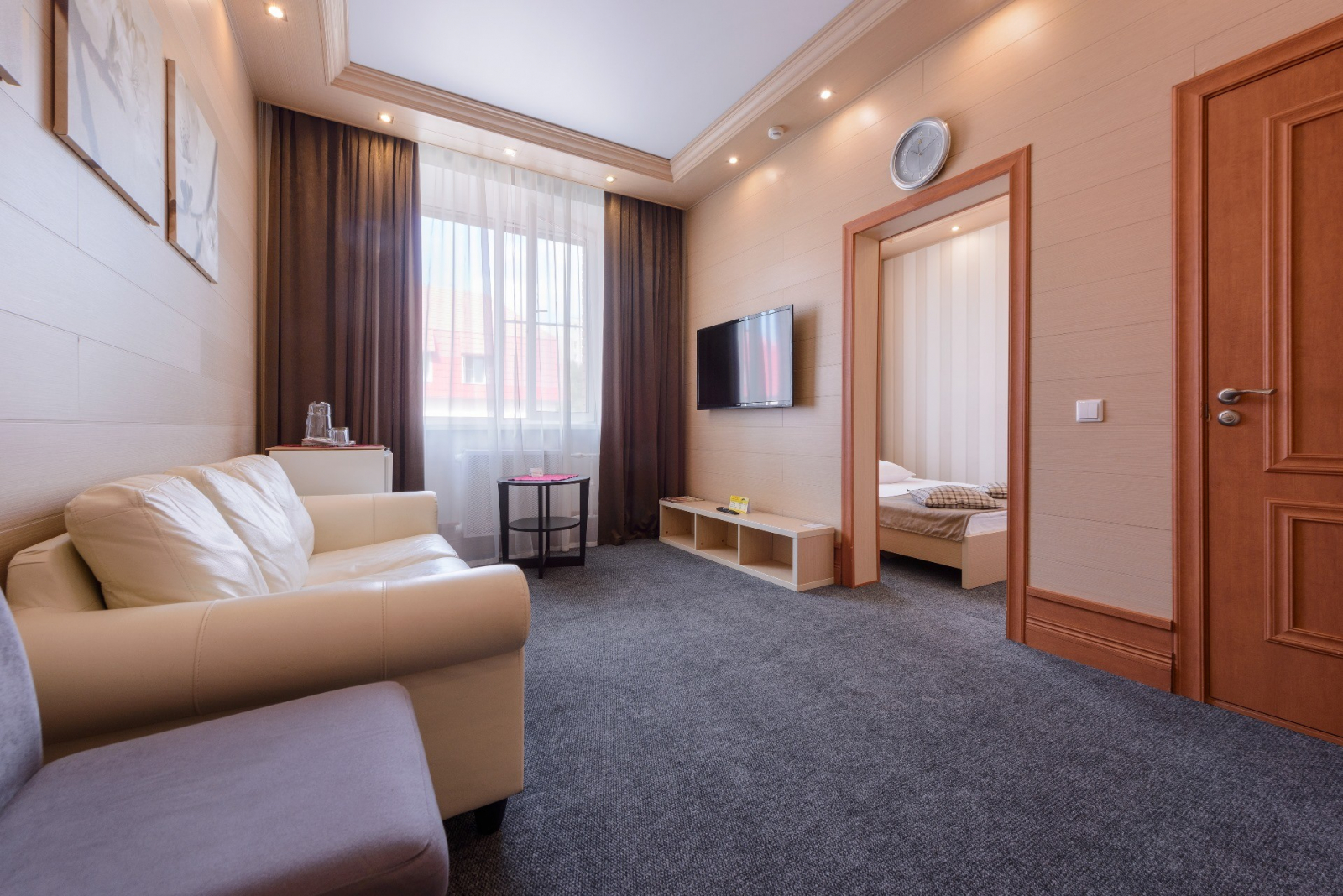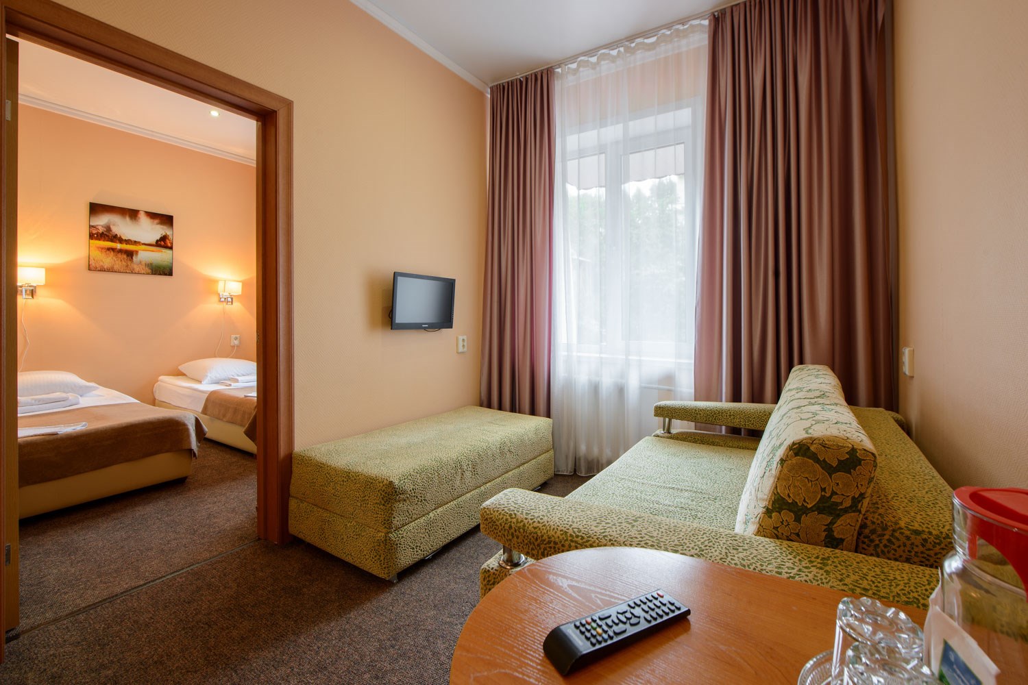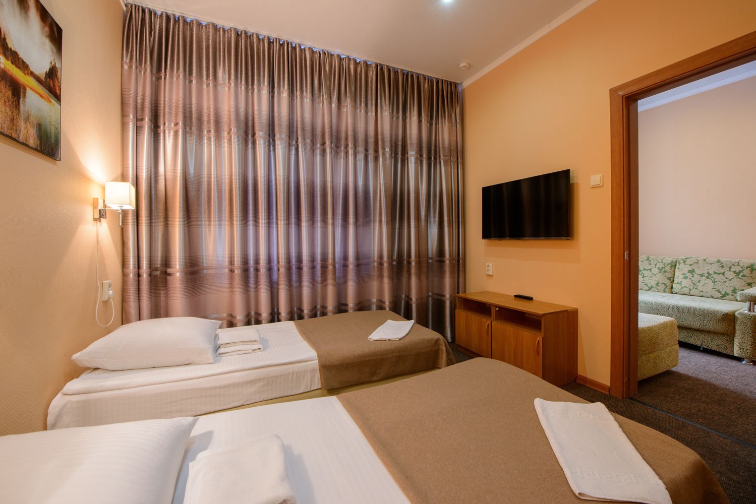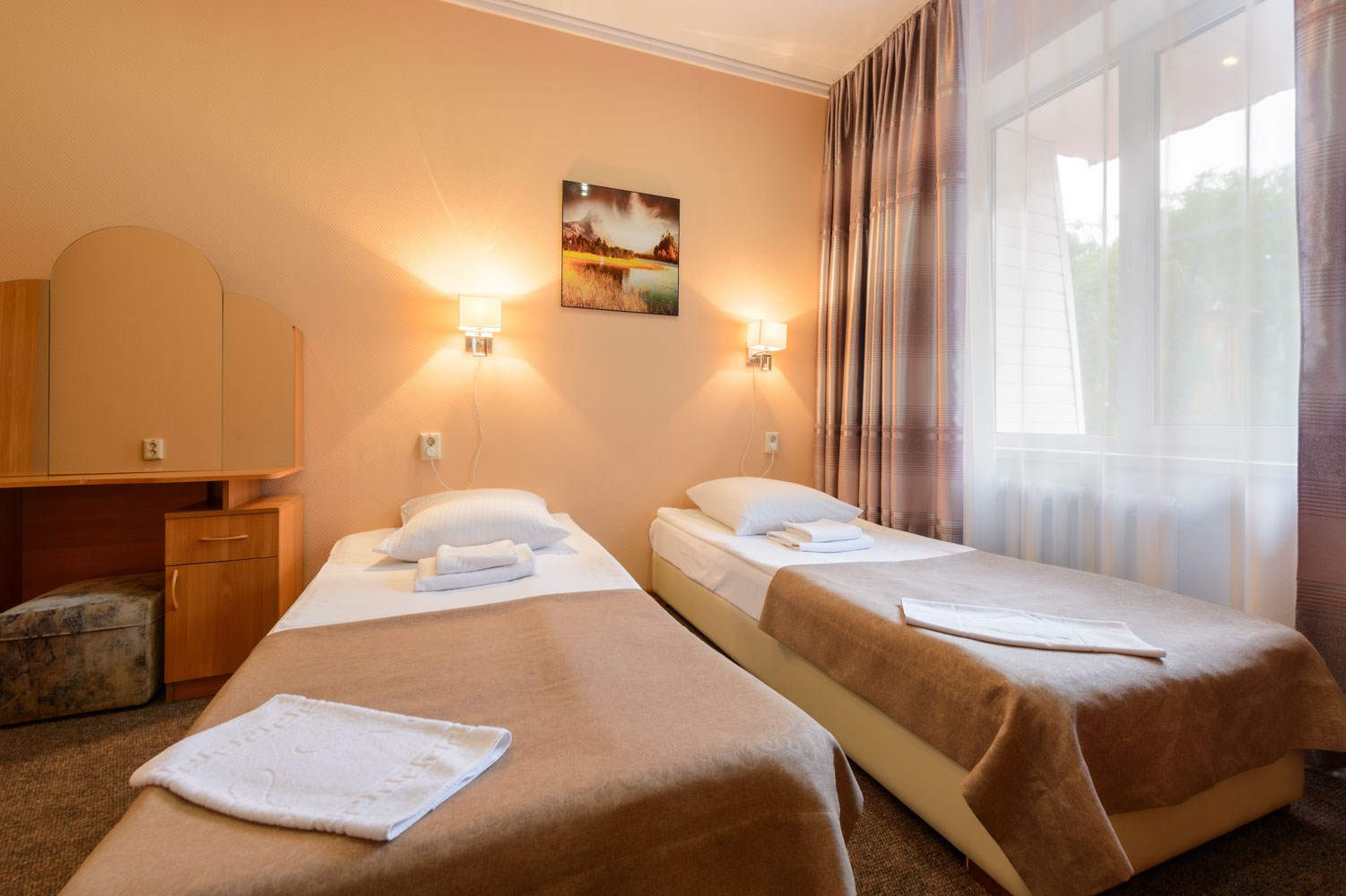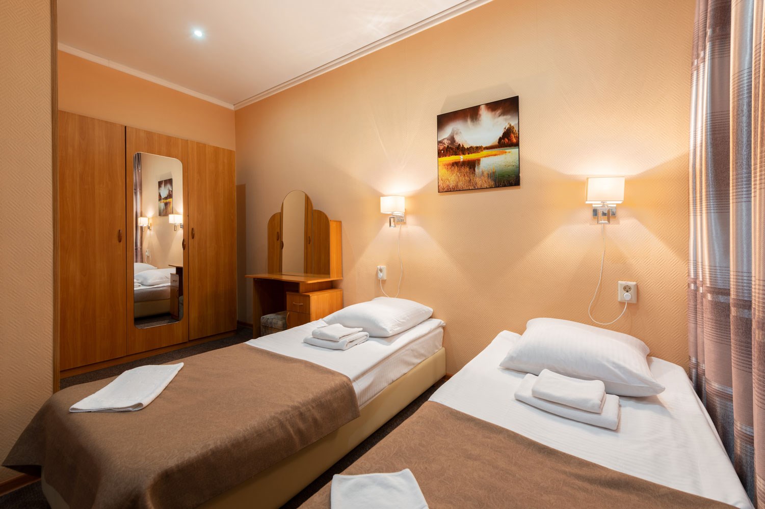 Площадь номера - 25-30 кв.м. 2 осн. места. 2 доп. места. Балкон. Мебель: вешалка, зеркало, кровати односпальные /одна двуспальная кровать, прикроватные тумбочки, стол, стулья, шкаф. Оборудование: вентилятор, набор посуды, сейф, телевизор, холодильник, чайный набор посуды, электрочайник. Санузел: с душем или ванной, туалетные принадлежности, фен. Сервис: room-сервис, смена полотенец, смена постельного белья, уборка номера.